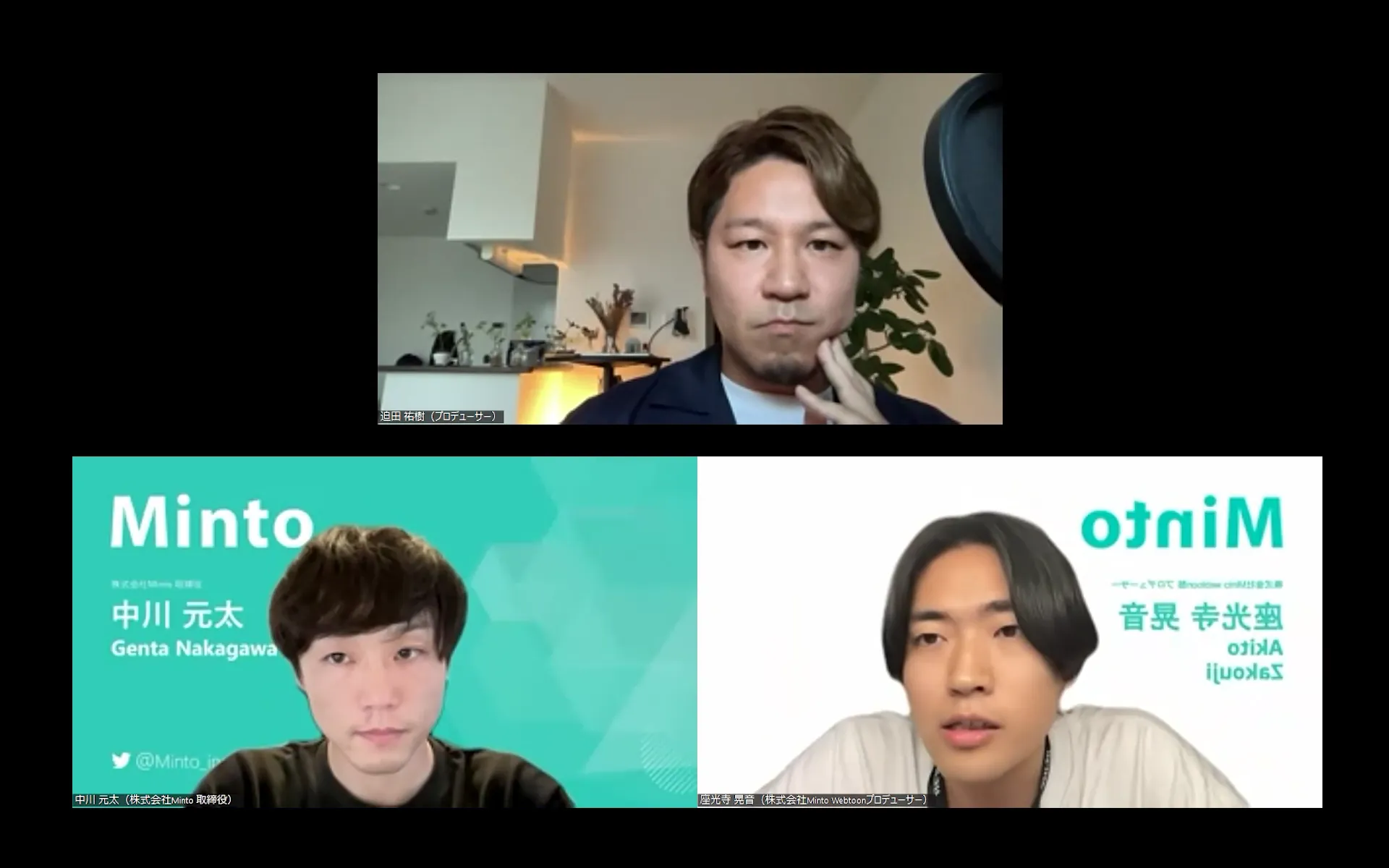 まず、第1部ではプロデューサーの迫田祐樹氏を司会にお迎えし、株式会社Minto取締役の中川元太氏と同社Webtoonプロデューサーの座光寺晃音氏に「Webtoonの今までとこれから」について語っていただきました。お二人の話をまとめると、